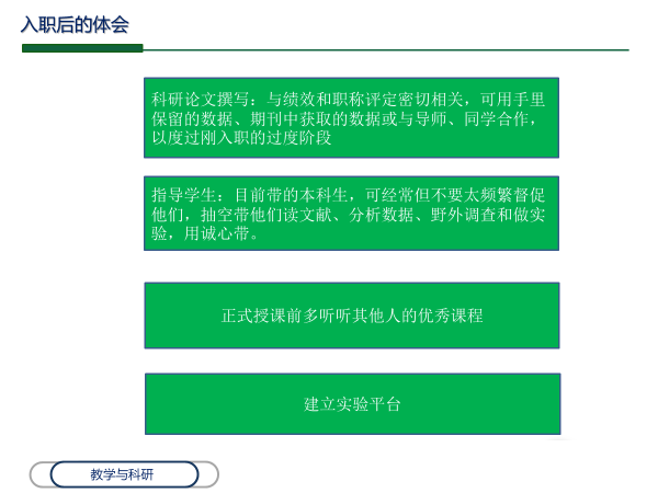 随后,作为一位已经成功上岸的“青椒”代表,就职于南阳师范澳门六合彩开奖记录资料 的王家鸣同学从“应聘高校教师岗应如何准备”与“入职半年后的一些体会”两方面分享了他的求职经验。他首先对应聘中需要注意的,如何选择心仪高校、简历制作与投递、所需要的教学方面准备等进行了详尽的介绍。他建议选择高校的时候,可以从就业地域、未来发展和家庭生活这三个方面进行综合考虑。然后,针对入职之后需要注意的一些问题,展开细致的心得分享,包括职称评定、青年教师培养方案等文件以及了解政府及学校的人才服务政策等内容,从而成长为兼顾科研与教学的青年教师人才。