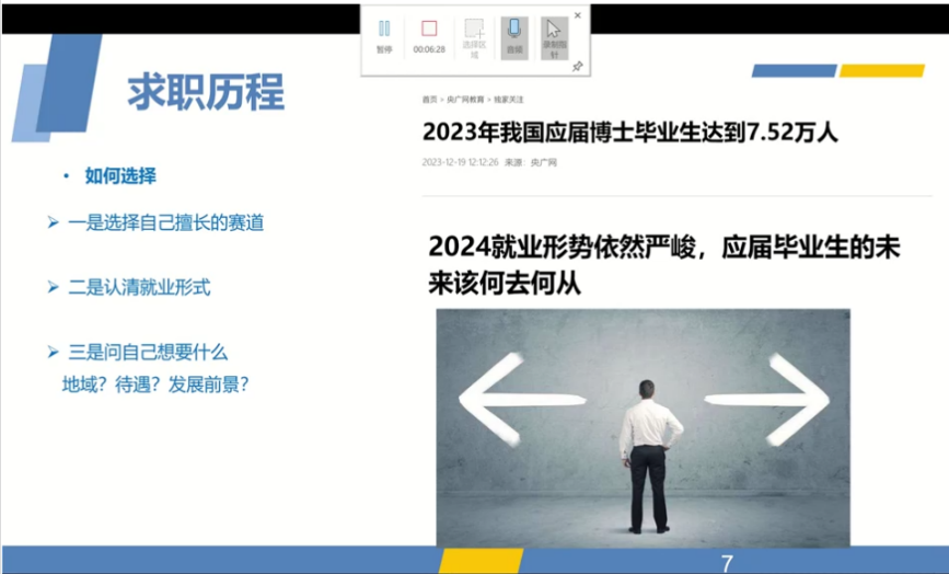 为引导研究生树立正确的择业观和就业观,不断推进澳门六合彩开奖记录资料 就业工作,2024年5月19日13:30,澳门六合彩开奖记录资料 在资环楼151研讨室举办“职”点迷津,共创未来——博士生就业经验分享会。活动邀请澳门六合彩开奖记录资料 23届校友王家鸣和李根、24届毕业生孟陈和王小玲四位嘉宾结合自己的求职经历进行分享。本次活动是由校学生职业发展中心主办、澳门六合彩开奖记录资料 承办的2024年“就业服务月”系列活动之一,活动由澳门六合彩开奖记录资料 博士生辅导员姚芳芳老师主持,20余名同学线上线下参加此次分享会。