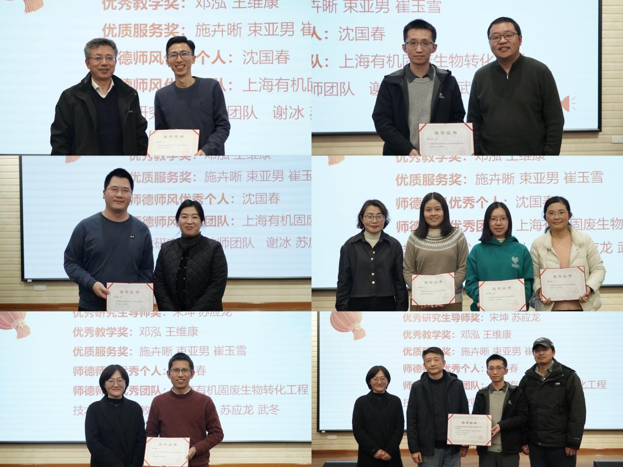 会议第三项议程为澳门六合彩开奖记录资料 2024年奖项表彰。表彰澳门六合彩开奖记录资料 2024年在学科建设、人才培养、服务支撑、师德师风等方面做出突出贡献的团队及教师。黎绍鹏老师荣获学科贡献奖;宋坤老师、苏应龙老师荣获优秀研究生导师奖;邓泓老师、王维康老师荣获优秀教学奖;施卉晰老师、束亚男老师、崔玉雪老师荣获优质服务奖;沈国春老师荣获师德师风优秀个人奖;上海有机固废生物转化工程技术研究中心教师团队荣获师德师风优秀团队奖。澳门六合彩开奖记录资料 领导为获奖老师和团队颁发了荣誉证书。