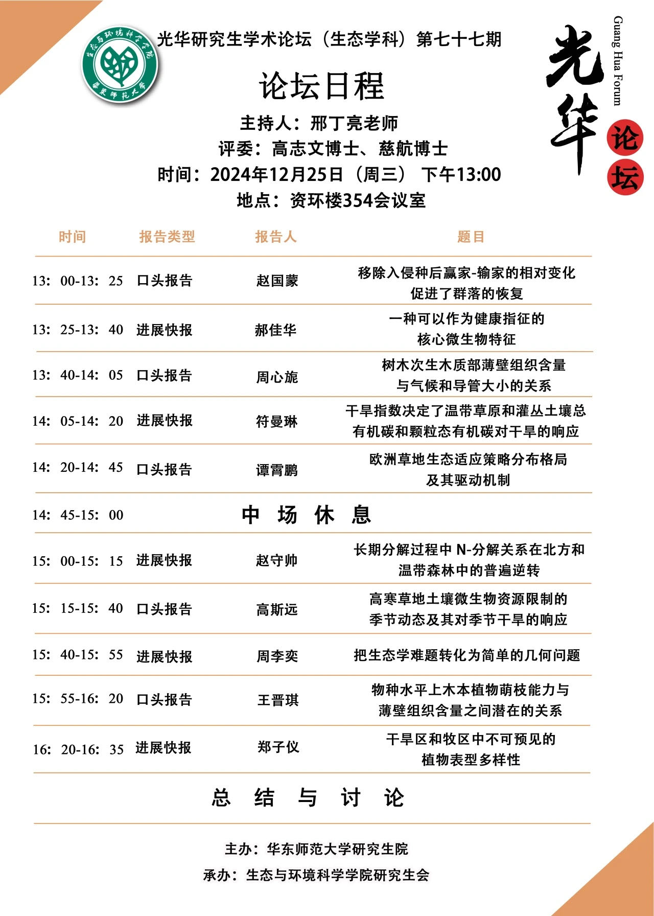 2024年12月25日下午13:00,澳门六合彩开奖记录资料 第77期光华学术论坛在资环楼354室顺利举行,本期论坛由邢丁亮老师主持,高志文博士、慈航博士作为点评嘉宾出席。