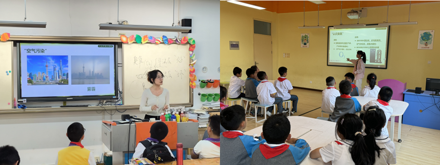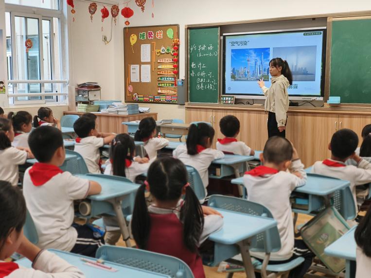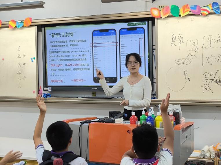 在第二环节,讲师们向同学们介绍地球的三大圈层,并抛出问题“空气的组成是什么?”同学们通过视频进一步了解空气并回答问题,讲师补充介绍空气的组成及其作用:人类呼吸、传播声音和保护地球都离不开空气。接下来讲师通过图片直观地向同学们展示了雾霾这一空气污染,由于法律及相关政策的完善和各个部门的关注,雾霾防治效果显著。与此同时,地表臭氧成为一种新型污染物,引起大家的关注。讲师展示了2024年4月全国城市空气质量报告中臭氧含量,空气中的臭氧虽然看不到,闻不着,却已经在潜移默化地影响着居民的生活。