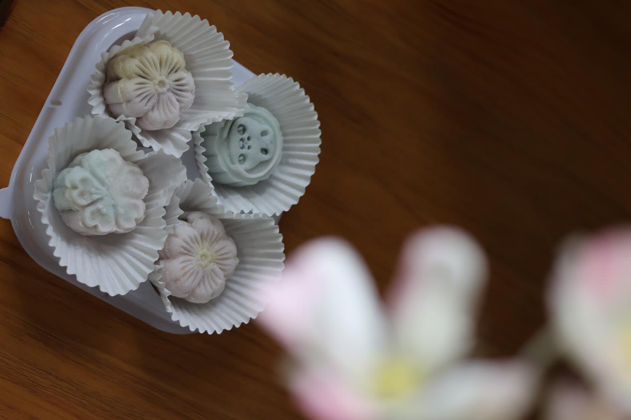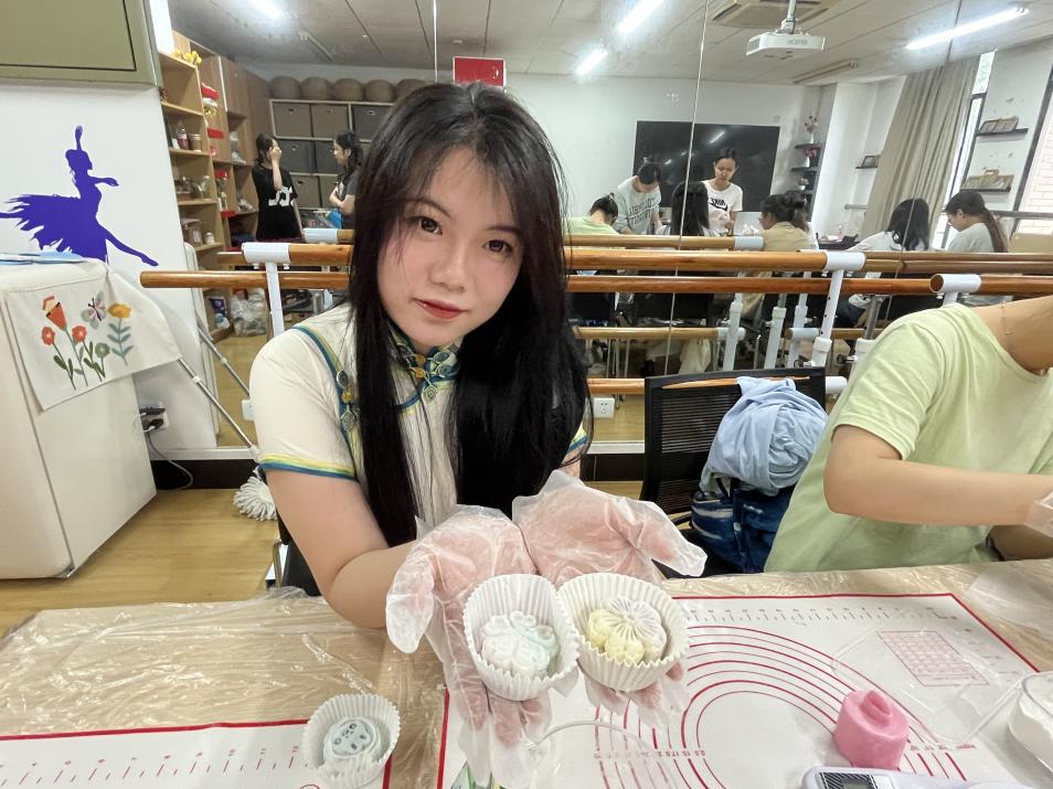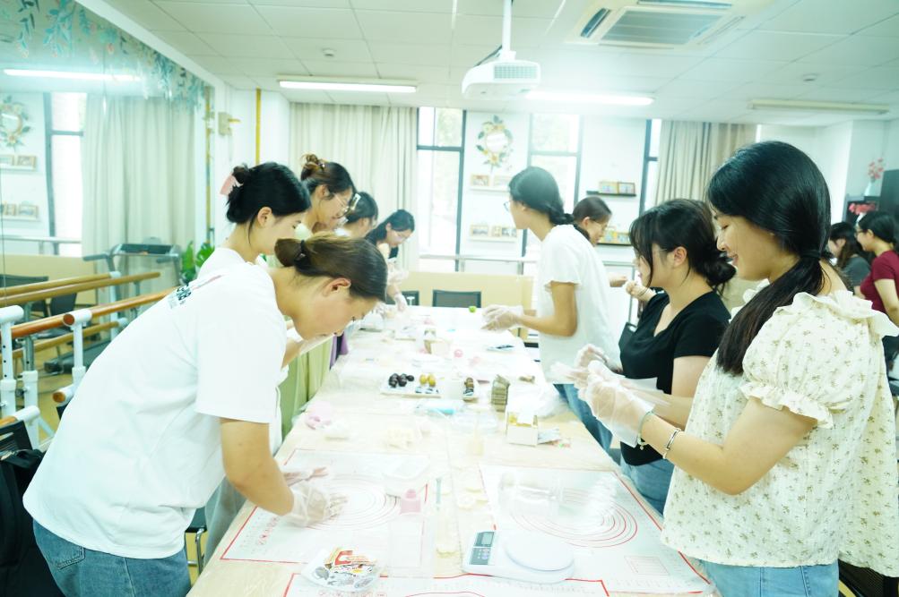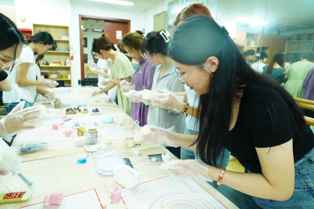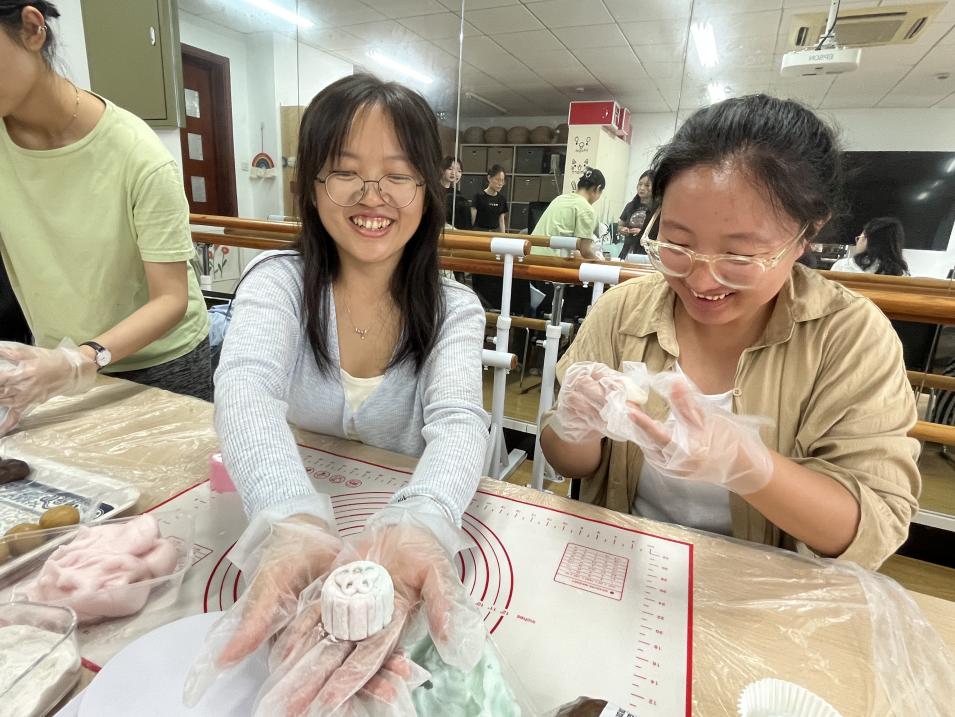 活动伊始,董柳彤同学为大家讲解了冰皮月饼的步骤、示范了月饼的制作流程并说明了相关注意事项。在此次活动中,研会生涯部为大家准备了各种的馅料,包括红豆馅料、绿豆馅料、紫薯馅料、芋泥馅料等不同口味,饼皮也分别用不同的果味粉调色,同学们可以根据自己的喜好选择不同颜色的饼皮,好看的同时也让人食欲大开。同学们兴致盎然、跃跃欲试,互相协作,一起动手制作冰皮月饼,揉饼皮、包馅料、裹上熟食粉、最后挑选自己喜欢的模具,将揉好的月饼放进去轻轻一压,一个个精美的月饼便制作完成了!制作的过程中,大家互相帮助,共同学习,分享各自制作月饼的技巧,相互展示自己满意的作品,通过本次活动,不仅增强了同学之间互帮互助的意识,并且也在无形之间拉近了彼此之间的感情。