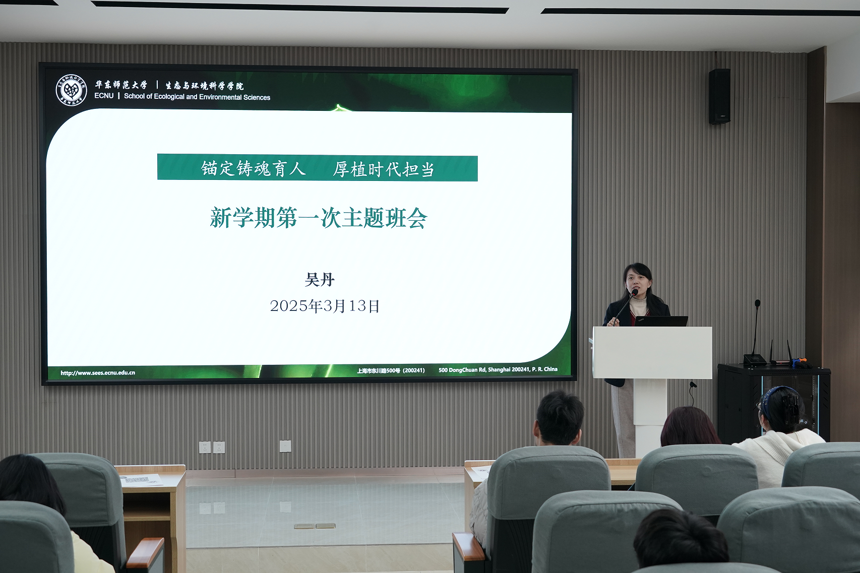 随后,吴丹老师以“锚定铸魂育人 厚植时代担当”为主题开展了新学期第一次主题班会。展望新学期,她从“思想引领、学业规划、就业实践、创新创业、校园生活”“五个方面展开。第一,思想引领方面:强调学习全国两会精神的重要性,引导同学们以全国人大代表和政协委员为榜样,厚植家国情怀,增强时代责任感;第二,学业规划方面:解读研究生学业奖学金、国家奖学金的申请要求,强调毕业论文开题与小论文撰写的重要性;第三,就业实践方面,介绍了目前的就业形势和本学期即将开展的就业指导活动,鼓励同学们积极参与,做好充足的求职准备,提升就业竞争力。同时鼓励加入小青杉志愿者团队,参与“生环小课堂”“低碳生活周”等志愿者活动;第四,创新创业方面,鼓励同学们积极参与“青杉杯”“双碳大赛”等各类竞赛活动,激发同学们的创新思维与实践能力;第五,校园生活方面,介绍学校心理咨询与精神卫生服务、澳门六合彩开奖记录资料 公共空间改造等方面的最新进展;通过案例和事故通报,开展实验室安全和反诈教育;最后,展示了学校AI门户、企业微信等数字化工具的使用方法,为同学们的学习与生活提供便利。