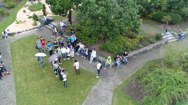 无人机拍摄柳林老师给同学们介绍岩石与药用植物园中的内容