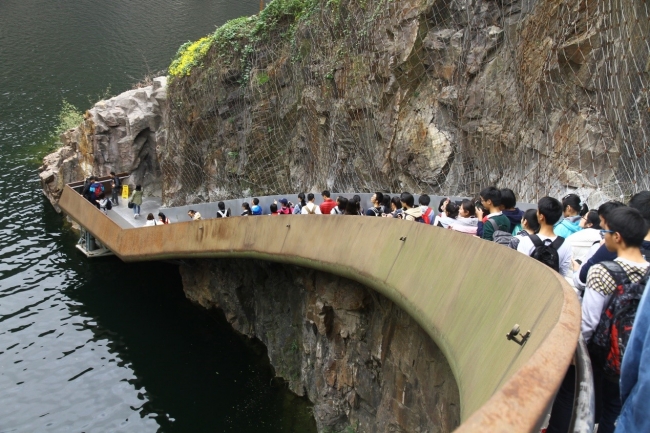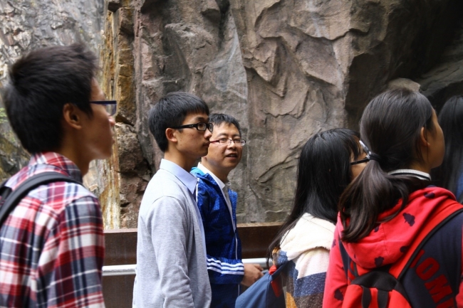 矿坑花园的原址为一处采石场遗址,设计者通过生态修复,并对深潭、坑体、迹地及山崖进行适当的改造,使其成为一座风景秀美的花园。参观过程中,柳林老师从地质环境灾害的角度出发,为同学们详细讲解了矿坑可能发生的地质环境灾害及可采取的防范措施和手段。