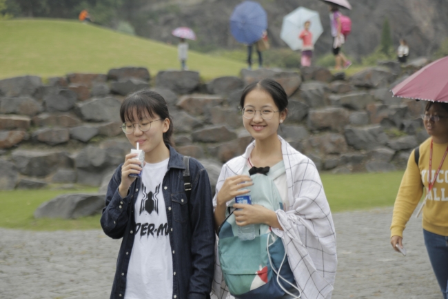 绵绵细雨,也淋不走大家的好心情,一把把小花伞凑在一起,成了辰山植物园一道美丽的风景