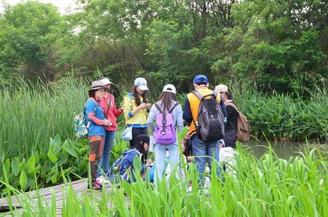 学生正在仔细观察河道两岸的湿地生态系统特征
