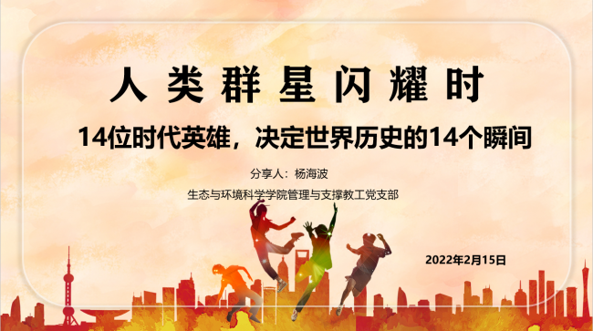 杨海波老师向大家推荐和介绍了奥地利著名作家茨威格写的历史传记经典《人类群星闪耀时》一书,并分享了自己的读后感想。这本书分别展现了14个决定世界历史的瞬间:千年帝国拜占庭的陷落、巴尔沃亚眺望水天一色的太平洋、亨德尔奇迹的精神复活、老年歌德热恋的悲歌、滑铁卢的一分钟、英雄的瞬间、南极探险的斗争、西塞罗和威尔逊的梦想与失败以及马赛曲神佑般的创作。茨威格也在书中传递了一种自己独特的历史观,一些微不足道的小人物在某些时刻的决定和偶然发现可能会改变历史长河的走向。此外,杨老师还分享了自己读了这本书的个人感受,既对作者所持的个人行为会影响历史发展的观点表示认同,也对作者有些过分夸大这种影响作用的观点持保留看法。
