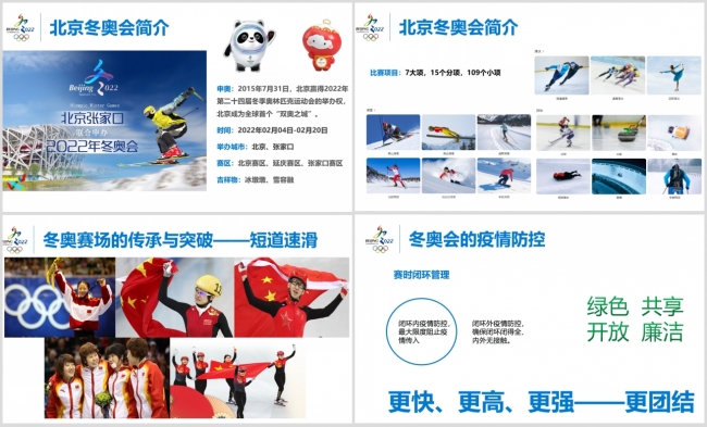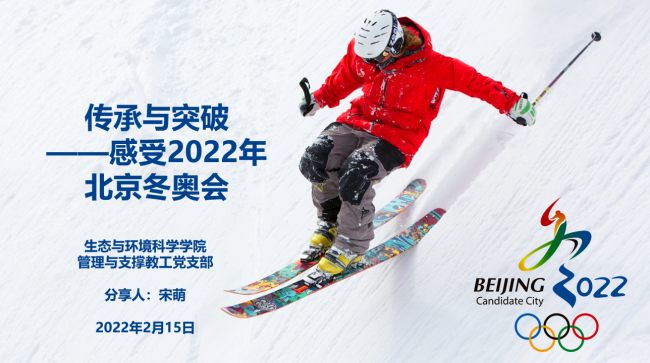 宋萌老师分享的题目是《传承与突破——感受2022年北京冬奥会》,本届冬奥会是所有冰雪运动员的一次盛会,受到多国媒体的高度评价,北京冬奥会也成为迄今收视率最高的一届冬奥会。宋老师首先介绍了北京冬奥会的基本情况,包括举办时间、地点、赛区、吉祥物、体育场馆和比赛项目。宋老师还从中国短道速滑队的发展历程,速度滑冰运动员高亭宇夺冠以及雪上项目的历史超越分享了北京冬奥会中的传承与突破。这种传承,不仅仅是冰雪运动多年经验的代代传递,更是一辈辈体育精神的传承。在冰雪运动的参与中展现奋斗精神,在拼搏中超越自我,这种精神风采,既抵达了奥运精神的内涵,也直抵人心,令人动容。致敬每一次突破,中国健儿们的每一步拼搏,都为中国冰雪运动的跨越作出了新的历史标注,中国人冰雪运动也必将在一代代的传承与突破中拾级而上,奔向新的高峰!最后宋老师分享了北京冬奥会疫情防控的相关情况,在所有人的共同努力下,在“更快、更高、更强——更团结”的奥林匹克格言感召下,北京冬奥会一定会成为简约、安全、精彩的奥运盛会而载入史册。