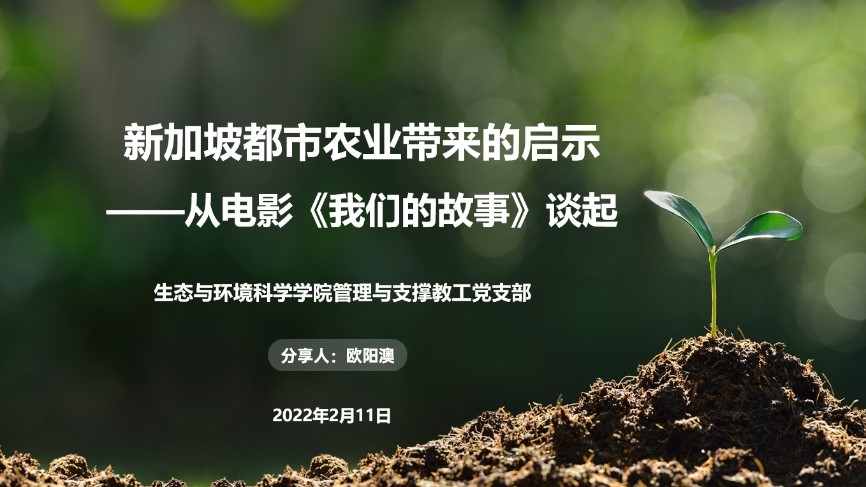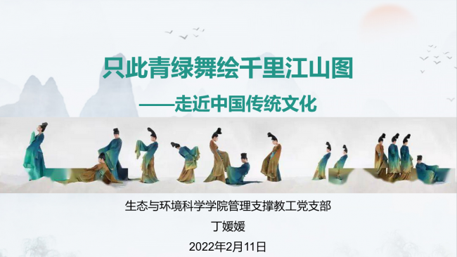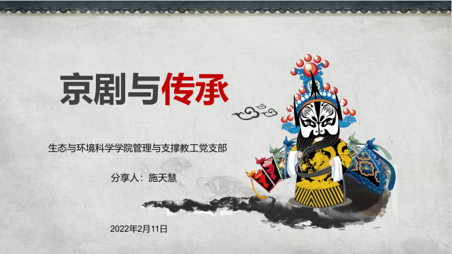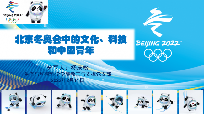 管理与支撑教工党支部举办第二场寒假学习分享主题活动,分享人是欧阳澳、丁媛媛、束亚男、杨庆松老师和施天慧同学。欧阳澳老师分享的主题是《新加坡都市农业带来的启示——从电影<我们的故事>谈起》、丁媛媛老师分享的主题是《只此青绿舞绘就千里江山图——走近中国传统文化》、束亚男老师分享的主题是《坚定四个自信,砥砺奋进——<厉害了,我的国>观后感》、杨庆松老师分享的主题是《北京冬奥会中的文化、科技和中国青年》、施天慧同学分享的主题是《京剧与传承》。