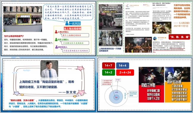 在《精准到平米的上海防疫——从一家奶茶店说起》中,路葵老师以2022年1月13日上海静安区愚园路228号一家面积仅20平米的奶茶店被定为中风险地区为例,讲述了精准防控的上海经验。将疫情防控颗粒度精准到平方米级,看点是“小”,背后则是“精”,是科学防治、精准施策。能够有这样的“精”,因为我国已经有着强大的技术能力、强大的防疫系统运转和支撑,也因为有着两年抗疫经验的科学积累,这是我国疫情防控水平不断提高的力证。在分享中,路老师还回顾了2021年10月31日晚上海迪士尼乐园的大规模核酸检测,分享了上海疫情防控体现出的“快、稳、准、暖”四大特点。分享中,路老师讲述了在过去四十多年的改革开放历程中,中国城市基层治理经历的从 “块区化”到“网格化”再到“精细化”的发展过程。疫情防控的“上海速度”与“上海精度”反映出的是“绣花”般的精细化城市管理,彰显了基层社区治理的温度、温情、温暖与风度,揭示出城市管理、社会发展、国家治理的秘密。