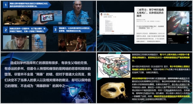 在《你与恶的距离有多远——由热播剧<开端>谈网络暴力乱象》中,路葵老师结合近期的热播电视剧《开端》讲述了剧中“公交车爆炸案”的背后反映出的网络暴力乱象。电视剧是一部以时间循环为题材的科幻悬疑剧,一次次“时间循环”让事件最终得以真想大白,阻止了悲剧的发生。但现实生活中没有可以一次次重头再来的“循环”,许多带着所谓“正义”面具的键盘侠们,在网络上通过留言对当事人进行攻击、谩骂、侮辱和诽谤,尽管往往不被大众所知,其对当事人的伤害却是实实在在的,而这样的伤害,不止是身心,甚至是于生命。路老师结合2022年1月24日河北寻亲男孩刘学州自杀的悲剧,分析了网络暴力的危害和产生的原因。网络空间的环境生态如何,深度影响每一个人,更依靠着每一个人。在“人人都有麦克风”的年代,借助网络扩音器的加持,每一种声音的杀伤力都可能被放大成千上万倍,这更提醒每个人发言需谨慎,表达有边界。路老师也分享了对于“拒绝网络暴力,我们能做什么”的思考。网络暴力作为一个全球性难题,需要从德治与法治两个层面入手去治理。一方面要加强对网络暴力危害性和严重性的宣传,从激发共情和共识方面去提高公共责任;另一方面要进一步健全法律法规,加大违法行为的打击,同时落实平台责任和执行好实名制机制,加强技术防控能力并加大维权救济,多管齐下才能实现标本兼治,让每个人免受网络暴力的伤害。