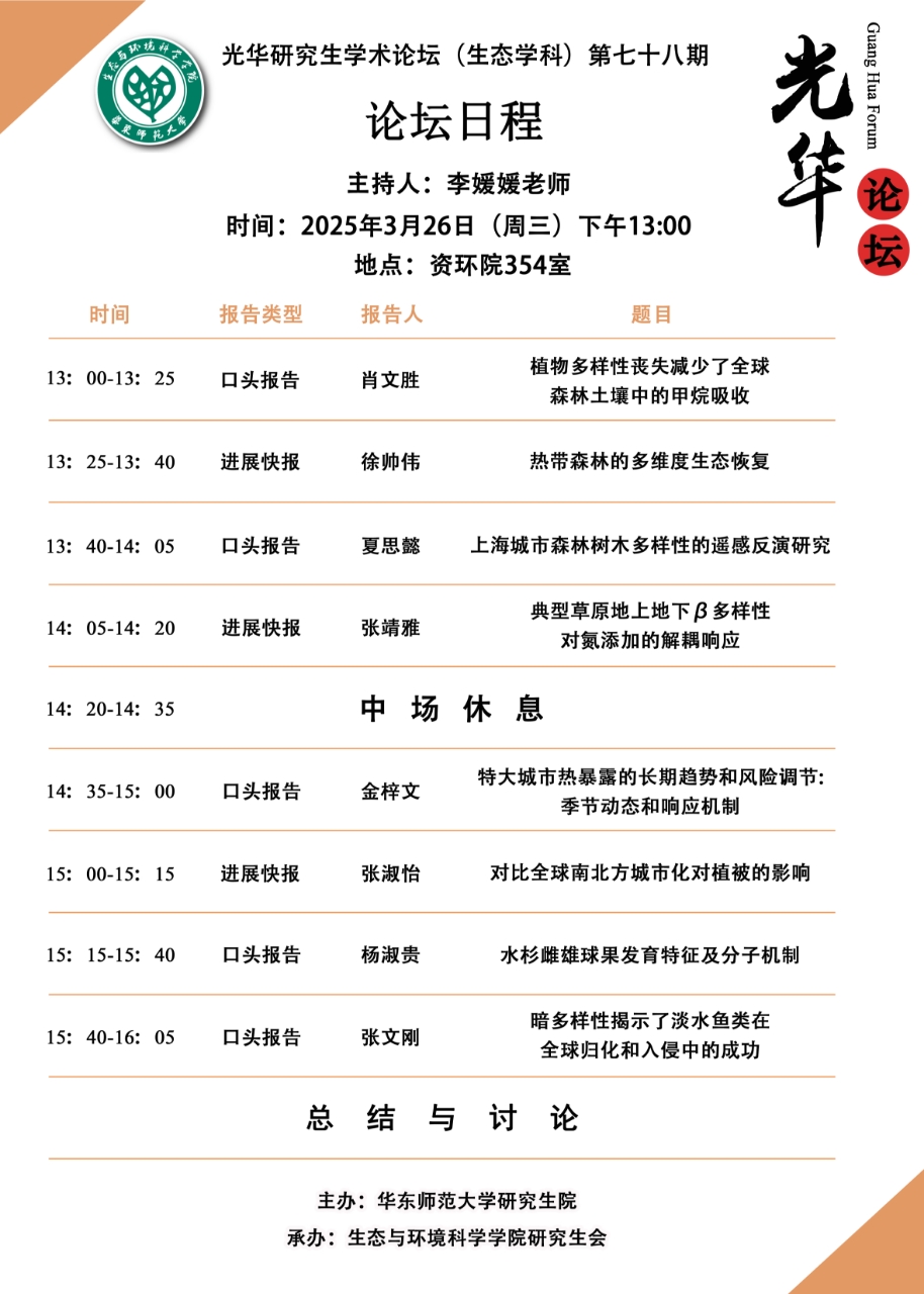 上半场第一位汇报人是来自周小奇老师课题组的肖文胜同学,他口头汇报的题目是《植物多样性丧失减少了全球森林土壤的甲烷吸收》。试验结果发现植物多样性增加可显著提升土壤甲烷吸收能力,模型也表明,全球森林土壤的甲烷汇能力因植物多样性增加而提高。因此,维护高植物多样性是应对气候变化的重要策略,建议将多样化的植物种类纳入土壤甲烷汇模型,以优化生态系统韧性。第二位汇报人是来自黎绍鹏老师课题组徐帅伟同学,他进展汇报的题目是《热带森林的多维度生态恢复》。研究结果发现热带森林及其土壤具有很强的恢复力,通常在120年内所有属性都能恢复。其中,土壤属性恢复最快(<10年),植物功能属性次之(<25年),森林结构和多样性恢复较慢(25-60年),而多样性和组成属性恢复最慢(超过120年)。最大树干直径(Dmax)、结构异质性(SH)和物种丰富度(SR)是监测森林恢复进展的关键指标。第三位汇报人是来自宋坤老师课题组的夏思懿同学,她口头汇报的题目是《上海城市森林树木多样性的遥感反演研究》。该研究发现不同季节遥感参数的相对重要性不同,同一季节内,不同多样性指数的参数重要性排序差异较小。对于同一多样性指数而言,不同季节的参数重要性排序有较大差异。第四位汇报人是来自刘慧颖老师课题组的张靖雅同学,其进展快报的题目是《典型草原地上地下β多样性对氮添加的解耦响应》。研究结果表明在长期施氮条件下,植物群落与土壤种子库动态解耦,表现为地上β多样性先增后减,地下β多样性线性下降;地上禾草增加而杂类草减少,地下相反;地上和地下物种组成相似性降低。这可能由地上和地下对环境变化的不同敏感性和地下动态的时滞性导致。