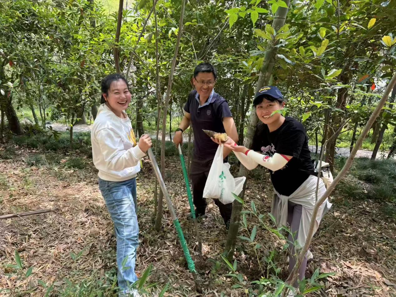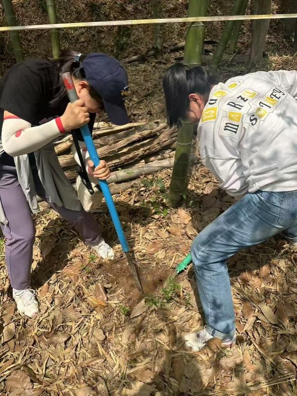 上午,老师们前往佘山国家森林公园东佘山园。佘山林场的王老师介绍佘山竹海的情况以及挖笋过程中的注意事项:注意个人安全,笋坑回填,笋壳不留园。老师们以小组为单位带上挖笋工具,开始了一场探春寻笋的深度体验。老师们手持铁锹,穿梭于佘山翠竹间,个个化身大力士,收获满满。