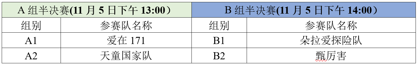 经过预赛以及附加赛的激烈角逐,共有四支队伍突出重围出线,分别是“爱在171”、“朵拉爱探险队”、“天童国家队”以及“甄厉害队”,四队抽签分为A、B两组进行半决赛。