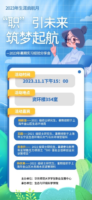 第二位分享嘉宾王超暑期于上海市长宁区生态环境局大气与水环境管理科实习。他首先强调了实习的重要性,并提出了实习的几个主要目标:深入了解行业内的具体工作内容和企业的工作环境、拓展就业方向、满足专业硕士的实践要求、丰富个人简历等。王超同学分享了自己寻找实习机会的渠道,包括通过师大青年网、华东师范大学选调生等途径获取实习信息。此外,他还分享了自己在实习期间参加各类会议、参与各项检查以及撰写各类文件的心得和经验,这些经历让他更深入地了解了生态环境局的工作流程和规定,锻炼了与人打交道的本领,提升了工作能力。