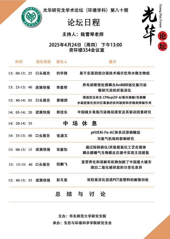 下半场的第一位汇报人是来自孙远奎老师课题组的张潇文同学,口头汇报的题目是《pH对Al-Fe-AC体系还原硝酸盐为氮气机制的影响研究》,聚焦于通过调控反应体系的酸碱环境,揭示铝-铁-活性炭(Al-Fe-AC)复合材料在硝酸盐(NO₃⁻)还原为氮气(N₂)过程中的作用机理。第二位汇报人是来自陆雪琴老师课题组的宋嘉怡同学,她进展快报的题目是《通过短程硝化/厌氧氨氧化工艺在载体耦合膜曝气生物膜反应器中实现主流脱氮》。通过MABR与PN/A工艺耦合,解决主流脱氮中溶解氧(DO)控制、菌群竞争、低温抑制等瓶颈,推动高效低碳污水处理技术发展。第三位汇报人是来自王兆慧老师课题组的但鹏飞同学,他口头汇报的题目是《富营养化和溶解有机物加剧了中国最大城市湖泊二氧化碳排放的日变化差异》。本研究揭示日尺度CO₂排放动态的主控机制,修正传统静态监测的误差,为城市湖泊碳核算及生态修复提供科学依据。第四位汇报人是来自陈超老师课题组的彭文星同学,他汇报的题目是《双羟基活化促进PET废塑料的解聚回收》。该研究创新性地利用双羟基化合物作为活化剂,协同亲核攻击酯键,促进PET高效解聚为对苯二甲酸和乙二醇,避免传统强酸/强碱工艺的高能耗与二次污染。