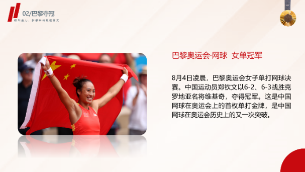 活动第一部分,吴鑫涛向大家分享了巴黎奥运会网球女单冠军郑钦文的辉煌战绩和不懈努力。8月4日凌晨,在巴黎奥运会女子单打网球决赛中,中国运动员郑钦文以6-2、6-3战胜克罗地亚名将维基奇,夺得冠军。这是中国网球在奥运会上的首枚单打金牌,是中国网球在奥运会历史上的又一次突破。吴鑫涛在分享中提到,2019年底,当疫情肆虐全球时,许多球员选择回国避疫,但郑钦文却坚持在海外继续训练。在西班牙疫情最严重的时期,她甚至需要早上4点半起床,训练到晚上7点结束。这种超乎常人的自律和坚持,为她后来的弯道超车提供了坚实的基础。在接下来的几年里,郑钦文参加了近30项比赛,几乎没有休息,用一场又一场的比赛锤炼自己的技术和意志。郑钦文的故事,不仅仅是个人的成功史,更是中国体育精神的传承史。她曾说:“我一直都相信薪火相传,不管什么都是需要传承的。如果我今天的胜利可以为更多的孩子带来网球梦,我觉得这一切都是值得的。”从李娜到郑钦文,中国网球运动员们用实际行动诠释了什么是坚持与努力,什么是梦想与追求。他们的成功,将激励更多年轻人勇敢追梦,为中国体育的未来注入新的活力。