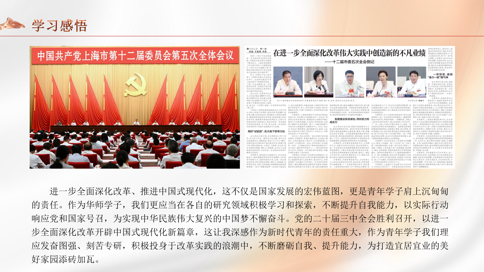 首先,第二党小组成员李嘉琪同学率先发言,她向大家详细解读了全会的核心成果——《中共上海市委关于贯彻落实党的二十届三中全会精神,进一步全面深化改革、在推进中国式现代化中充分发挥龙头带动和示范引领作用的决定》。这一具有里程碑意义的文件,为我们描绘了上海在新时代继续深化改革的宏伟蓝图,涵盖了经济体制的深化、全面创新体制机制的健全、“五个中心”建设的推进,以及各领域改革的统筹兼顾,发展与安全的协调并进,和党对改革的坚强领导。
