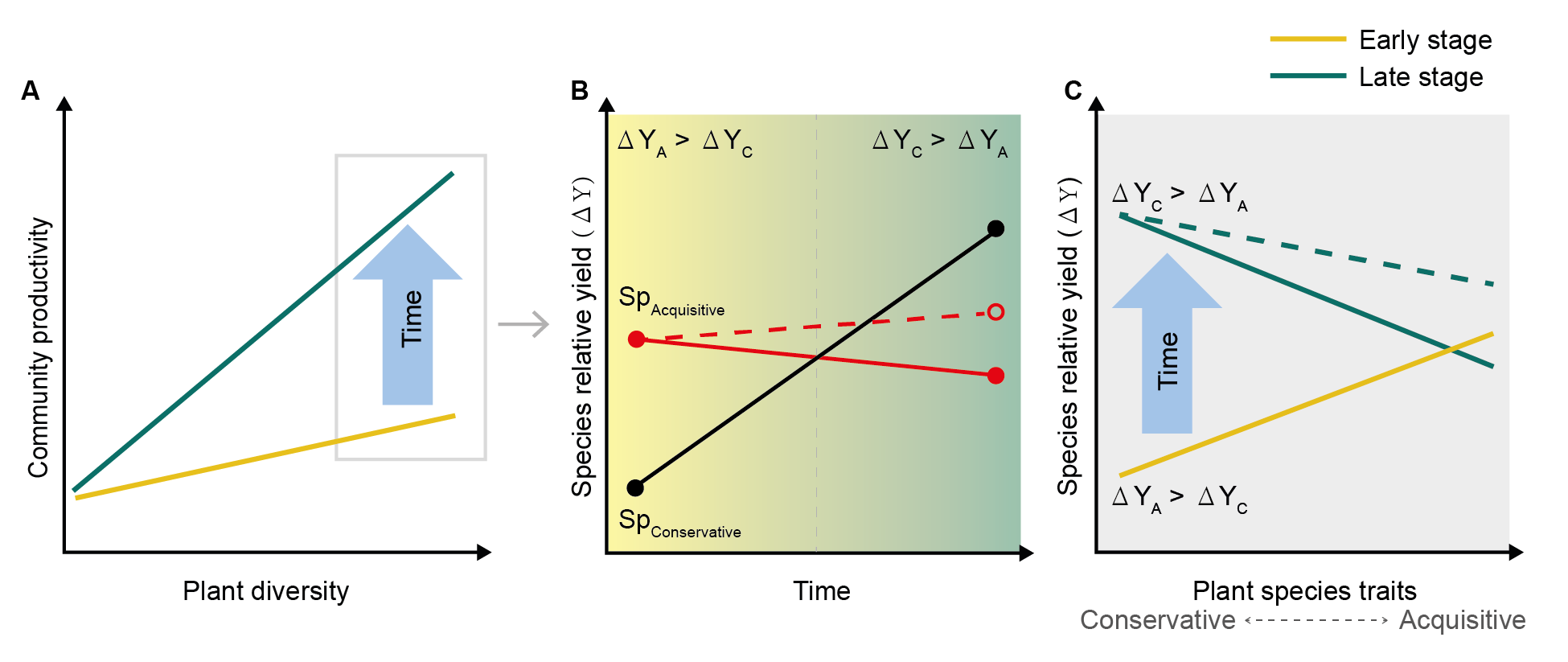 随着全球变化加剧,生物多样性丧失如何对生态系统功能和人类福祉的影响已经成为最受关注的科学问题和社会热点。在过去半个世纪,生态学家在全球模拟建立了近百个生物多样性灭绝控制实验,用来检验物种丧失对生态系统生产力等功能的影响过程和生态后果。研究发现,当物种“非随机”灭绝时,草原生产力和森林产材量会大幅减少。换言之,生物多样性越高,生态系统生产力更大,从而为人类提供更多的生态系统服务功能。更为重要的是,生物多样性对生态系统功能的正向效应会随时间推移而逐渐增加。虽然这些研究发现极大地丰富了我们对生物多样性与生态系统功能关系维持的理解,但这种时间增强效应背后的生态学过程尚不清楚。