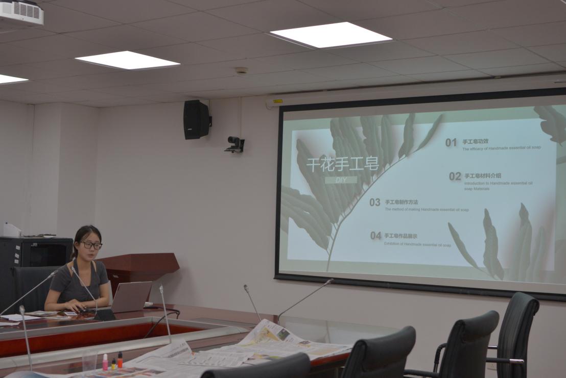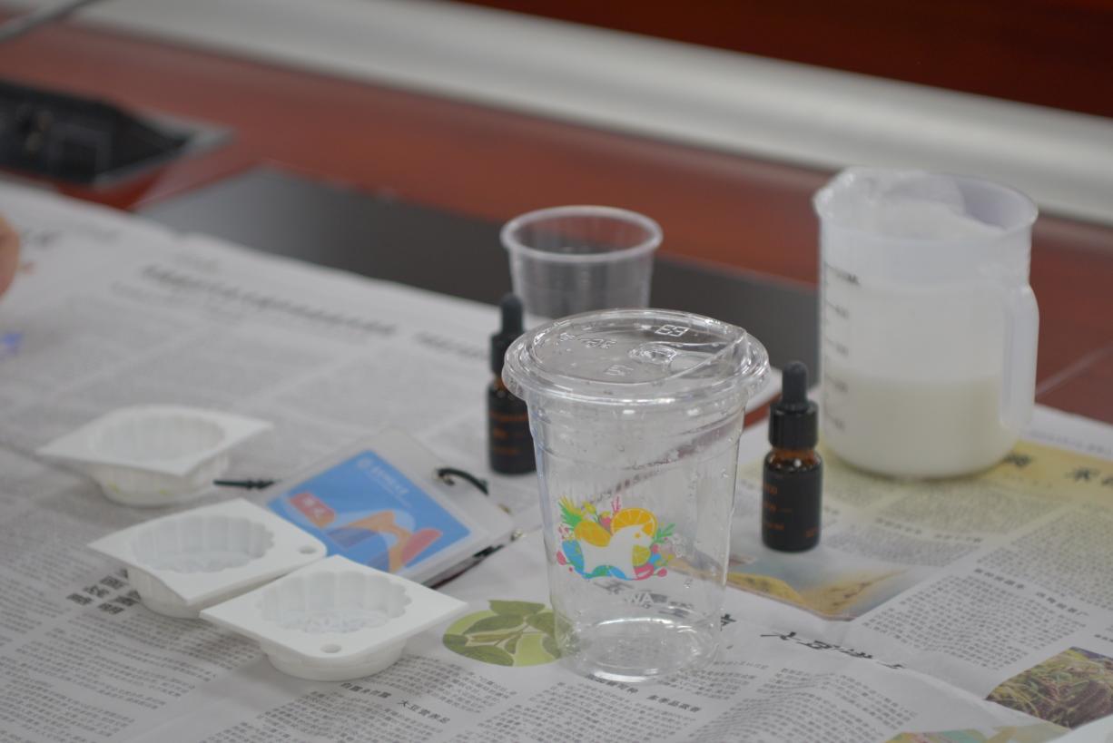 活动现场布置得温馨而雅致,干花、精油、皂基等材料一应俱全。张恂同学为大家讲解了干花手工皂的制作流程并说明了相关注意事项,细致的讲解激发了同学们的浓厚兴趣,现场气氛迅速升温,同学们纷纷动手尝试。