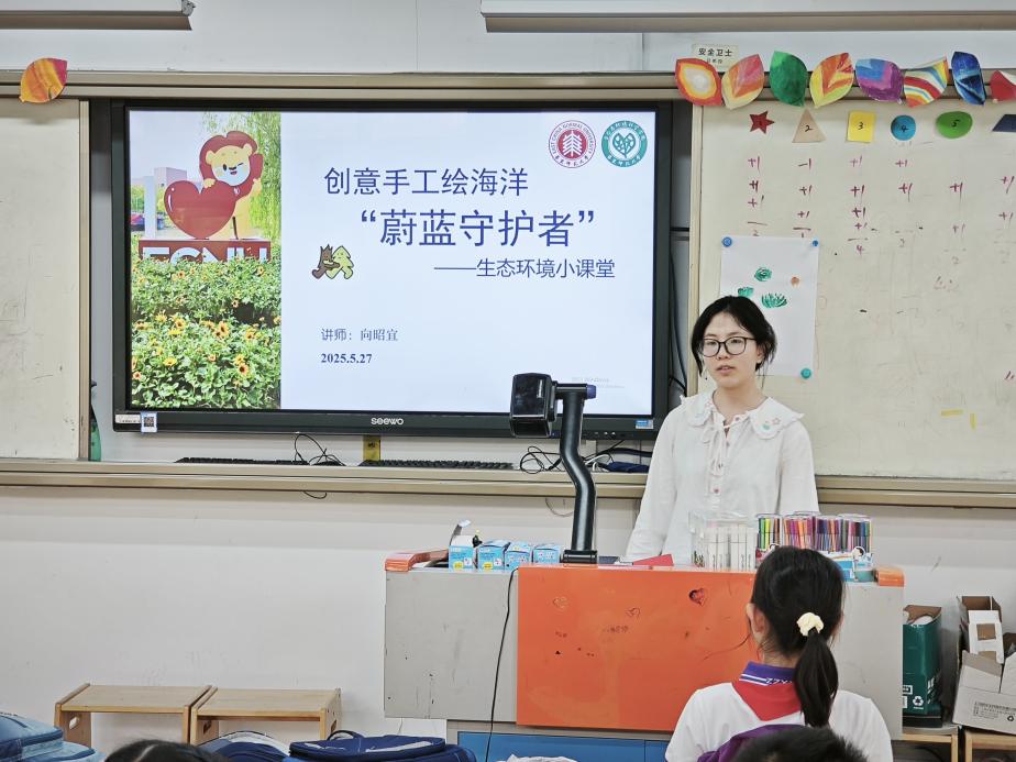2025年5月27、28日下午,生态环境小课堂讲师团前往华东师范大学附属紫竹小学、永德学校开展环教课,本次环教课的主题为“创意手工绘海洋—‘蔚蓝守护者’”,担任本次课程的讲师为向昭宜、夏妍妍和马江玲同学。