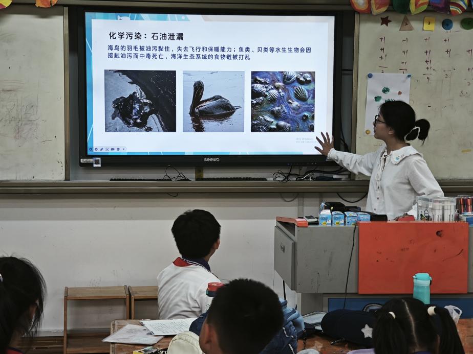 课程开始,讲师们通过播放一段有关海洋危机的视频,直观展示了海洋生物面临的困境:被渔网困住的海豚、沙滩上堆积如山的塑料垃圾……视频中的海洋生灵好像发出了自己的悲鸣。