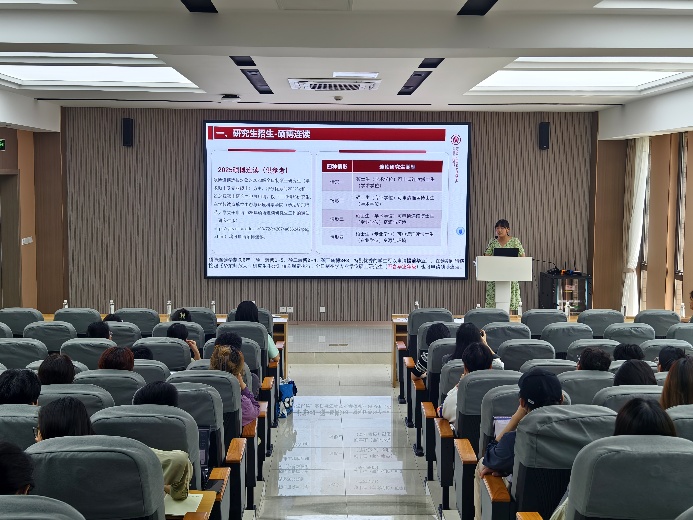 随后,研究生教务束亚男老师为在场师生深入解读了我校学硕转博、专硕转博的新政策与流程。她系统梳理了读博流程、政策要点、招生简章、报名时间节点、奖学金设置以及研究方向等关键信息。束老师着重强调,澳门六合彩开奖记录资料 为不同阶段的学生设置有不同的奖励政策,同时,澳门六合彩开奖记录资料 全力支持并鼓励学生参与高水平科研活动,旨在激励同学们积极进取和全方位助力学生明确学术规划,为同学们的科研之路保驾护航。
