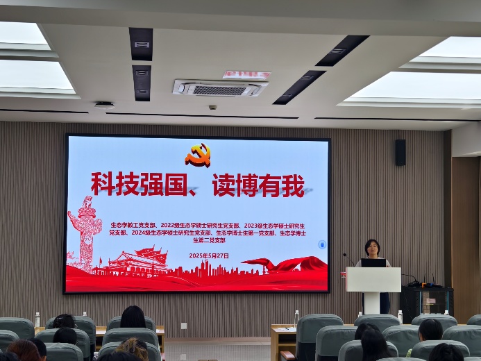 为深入贯彻科学家精神,明晰自身未来发展方向,2025年5月27日下午,生态学教工和研究生党支部联合举办了“科技强国,读博有我”主题党日活动。此次活动特邀2024级博士生陶琳防、2024级博士生张淑怡和2023级博士生刘子腾三位优秀同学,结合自身读博升学经历,分享科研技巧与读博经验。本次活动由郑泽梅老师主持,嵇渭萍书记、王晶晶副书记、研究生辅导员、生态学研究生导师及各支部党员积极参与,现场气氛热烈。