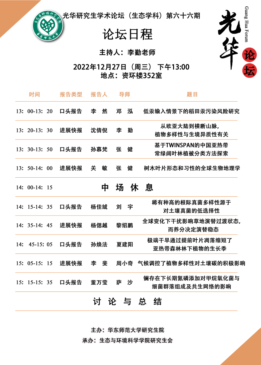 第66期研究生光华学术论坛(生态学科)在资环楼352室顺利举行,本期论坛由澳门六合彩开奖记录资料