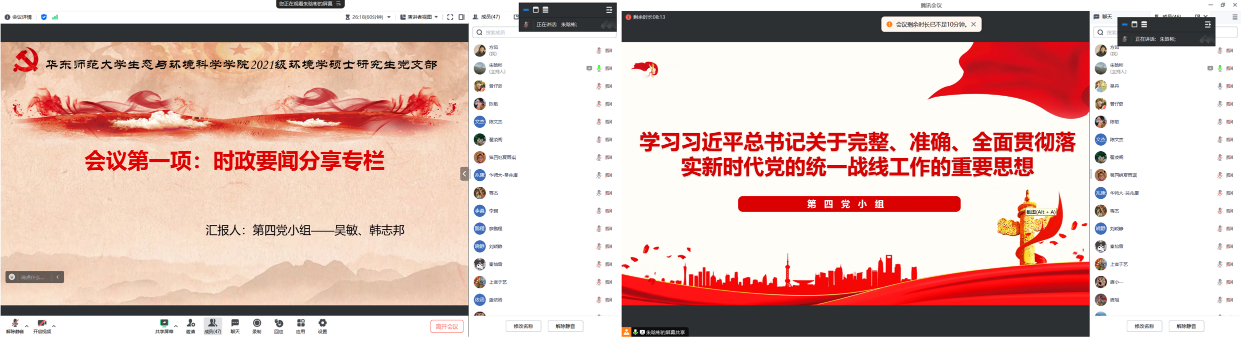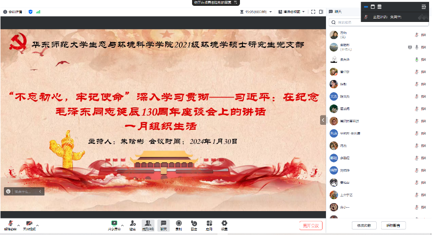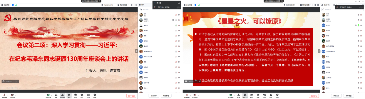 2021级环境学硕士研究生党支部开展“学习重要思想 牢记初心使命” 专题组织生活,深入学习贯彻——习近平在纪念毛泽东同志诞辰130周年座谈会上的讲话。本次活动通过腾讯会议平台开展,包括“时政要闻分享、理论党课学习”两个环节。本次活动由第四党小组主持,全体党员线上参会。