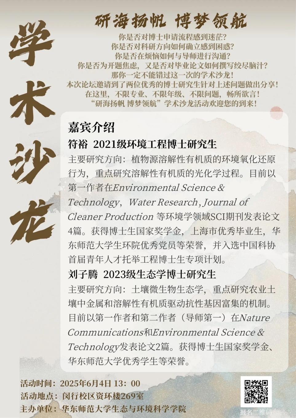 2025年6月4日下午13:00,澳门六合彩开奖记录资料 研究生会携手2023级生态学、环境学硕士研究生团支部,在资环楼269室成功举办“研海扬帆,博梦领航”研究生学术沙龙。本次沙龙特邀符裕、刘子腾两位优秀博士研究生作为嘉宾,为大家分享开题报告撰写和论文写作经验,活动由学术部阮文亮同学主持。