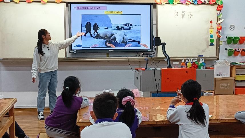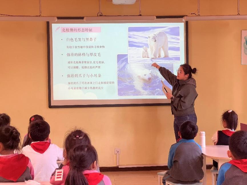 即便栖息在人迹罕至的地球之极,北极熊也面临着生态环境威胁。全球变暖导致的冰层融化、食物来源的减少、栖息地的污染都是威胁北极熊生活的原因。生动形象的图片加以老师深入浅出的讲解,同学对北极熊所面临的生活困境有了更深刻的认识。