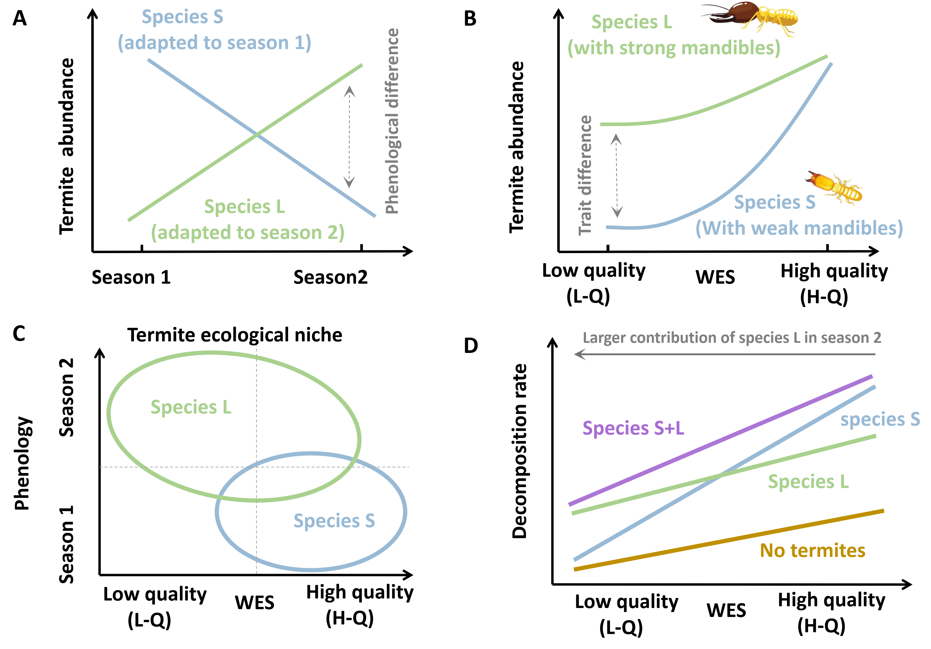 生态位差异和资源的互补利用是理解生物多样性调节生态系统过程与功能的关键理论之一。然而,关于动物和植物如何在时间和空间两个维度上通过生态位差异和资源的互补利用来促进凋落物分解和碳周转过程的机制尚不清楚。阎恩荣教授团队依托在浙江舟山群岛和天童山布设的 “China-FunLog”倒木分解长期控制实验,跟踪了27种不同功能策略的树木与5种白蚁的相互作用在四年不同季节的变化特征后发现:不同于热带地区,亚热带白蚁不同种类具有明显的物候错位,体型较小的白蚁(图1A)在夏季活动最为频繁,体型较大的白蚁(图1B)喜低温,在晚秋活动强,反映了白蚁活动的时间生态位差异(图2A)。与此同时,体型小的白蚁下颚不发达,主要取食营养含量高、木质密度低的树木残体,而体型大的白蚁下颚发达,能够取食各种营养与木质密度的树木残体,反映了白蚁取食偏好的生态位差异(图2BC)。