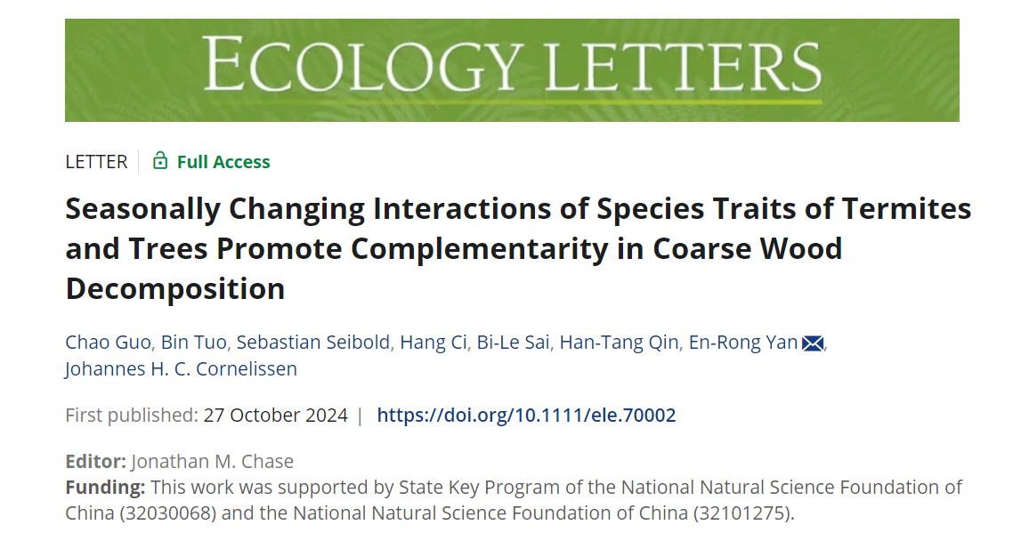 近日,华东师范大学阎恩荣教授团队在国际生态学顶级期刊Ecology Letters上发表了题为“Seasonally Changing Interactions of Species Traits of Termites and Trees Promote Complementarity in Coarse Wood Decomposition”研究成果,揭示了森林白蚁和树木功能性状通过季节性互补促进木质残体分解的生态学机制,为理解生态系统碳循环背后的生物多样性效应提供了新的见解。