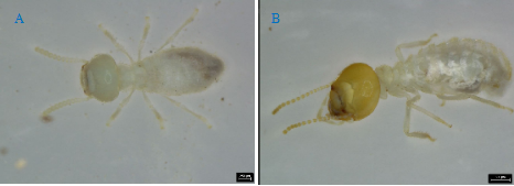 图1. 两种体型和口器发达程度不同的白蚁。A为小体型白蚁(Reticulitermes periflaviceps Ping & Xu, 1993),B为大体型白蚁(Odontotermes formosanus Shiraki, 1909)。